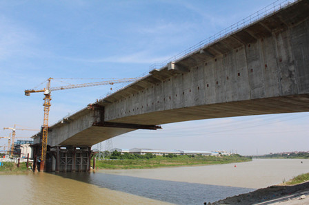 北江特大橋西引橋128米跨南沙涌四線連續梁全長284.7米,其跨度為貴廣鐵路同類型橋梁之首,從樁基到承臺,從墩臺到連續梁,每個主體都是重點控制性工程,其中連續梁全橋砼方量為13981立方米,墩臺砼方量為2908.3立方米,連續梁梁面頂寬22.1米、底寬16.6米,梁體為雙箱單室,最高梁體高度達9.5米。