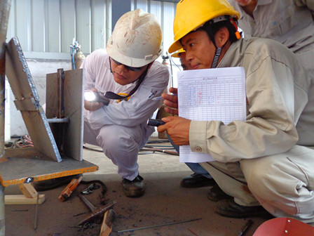 焊工是造船企業的重要工種,本次為焊工實操考試,考試級別較高??荚嚦龑讣拿恳粚雍缚p進行外觀檢查外,還對焊件進行X光拍片,檢查焊縫是否有夾渣、氣孔等,再進行綜合評分。考試合格者,由ABS發給焊工合格證。