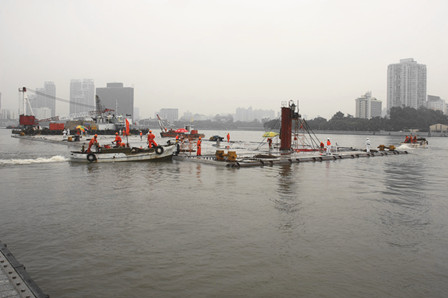 8月31日上午7:00~11:00,9月3日上午10:00~下午2:00,廣州市洲頭咀隧道第二批沉管E3、E4完成由干塢內浮運至工程位置上游位置系泊寄放。E3、E4沉管順利系泊寄放,二次圍堰即時可以施工,也可以加快后期暗埋段主體結構施工,大大節省隧道建造工期,為促進洲頭咀隧道早日建成通車。