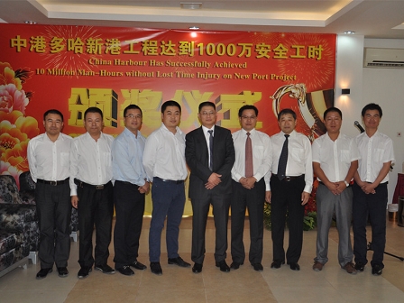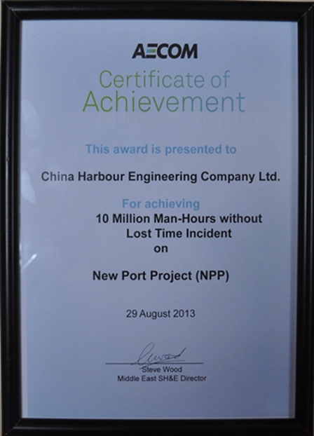 2013年8月28日,多哈新港項目安全管理再創(chuàng)佳績,順利實現(xiàn)10005695安全工時,9月12日,多哈新港項目1000萬安全工時慶典儀式在多哈新港項目部舉行,中國駐卡塔爾國特命全權(quán)大使高有禎、業(yè)主多哈新港項目管理委員會執(zhí)行董事Nabeel Mohammed Al-Buenain、咨工AECOM中東區(qū)域公司經(jīng)理Tim Verdon出席了此次慶典儀式。