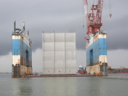 該分項工程共有沉箱33件,單件沉箱砼量為967m3,重約2420t,為喀麥隆基建史上最大的沉箱,分兩批出運安裝,第一批安裝21件,第二批安裝12件。自5月30號首件沉箱出運以來,項目部先后克服了船機設備維修、作業工人經驗不足等客觀因素的影響,多次組織相關部門及技術人員召開技術、安全交底專題會,討論并制定出完善的施工方案,并多次邀請到四航局、三公司等各級業務管理部門的多位技術專家進場進行技術指導,現場解決項目實施過程中出現的技術難題,積極組織協調人員、機械設備投入施工生產,根據天氣變化規律見縫插針進行施工,實現每兩天一件出運與安裝沉箱,有效地提高了工作效率,順利完成了該分項施工任務。