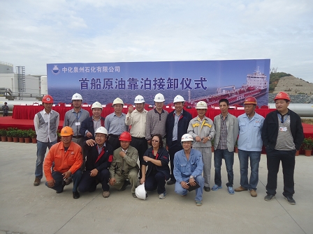 該工程原油接卸試運行生產情況良好,11月10日上午,中化泉州石化有限公司在工程現場舉行首船原油靠泊接卸儀式。中化集團公司副總裁兼中化泉州石化有限公司總經理杜國盛、五公司黨委書記陳慰斌等出席儀式。