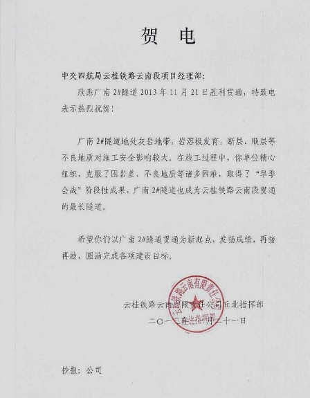 業主丘北指揮部在賀電中指出:“在施工過程中,你單位精心組織,克服了圍巖差、不良地質等諸多困難,取得了旱季會戰階段性成果,廣南2號隧道也成為云桂鐵路云南段貫通的最長隧道”。