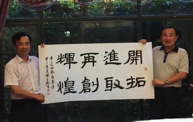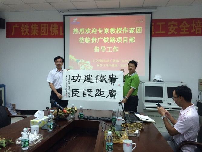 一座座鐵橋如鋼龍騰飛、一條條連續(xù)梁如彩虹飛越、一根根混凝土墩柱如銅墻鐵壁┅┅盛暑烈日下,四航局貴廣鐵路建設(shè)者斗酷暑、戰(zhàn)高溫,讓承建的貴廣鐵路穿山越水、跨越鄉(xiāng)村城市。貴廣鐵路工程的雄偉壯觀和四航人的拼搏奉獻(xiàn)精神讓深入工地的廣州市文廣新局副局長(zhǎng)、著名書法家陳春盛帶隊(duì)的專家教授作家團(tuán)一行震撼和感染,陳春盛向四航建設(shè)者贈(zèng)送了“貴廣鐵路建設(shè)功臣”書匾,表達(dá)了對(duì)建設(shè)者的敬佩。這是四航局“四心”讀書會(huì)舉辦“送書講學(xué)到貴廣工地”活動(dòng)的感人一幕。