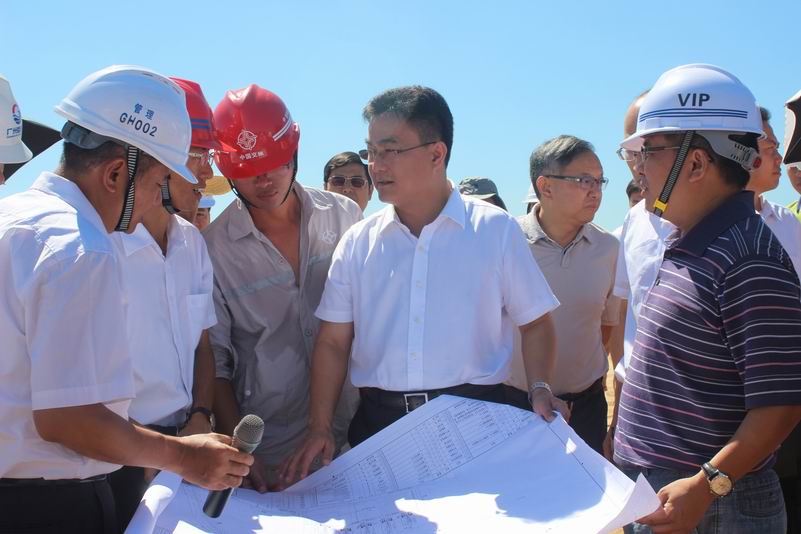 日前,海口市長倪強到四航局三公司承建的海口新海滾裝碼頭(一期)項目現場調研。