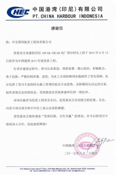中國港灣(印尼)有限公司發來感謝信,感謝四航局秉承“優質回報,合作共贏”的理念,在項目建設面臨工程時間緊、任務重等諸多困難時,能認真策劃、周密部署、精心組織、積極配合、勇于創新,嚴格控制質量、進度,為工程水工分部的順利實施提供了堅實保障。