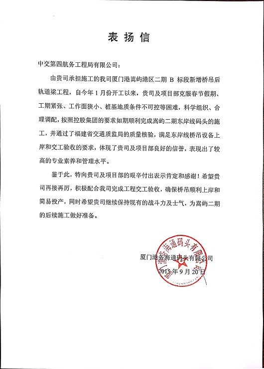 近日,四航局五公司承建的廈門港嵩嶼二期工程業主廈門港務海通碼頭有限公司再次發來表揚信,充分肯定五公司項目部在工程建設過程中的優異表現。這是繼8月10日收到主業表揚信后的再次肯定。