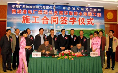 3月16日下午,防城港電廠10萬噸級煤碼頭及循環取排水溝道工程在南寧舉行施工合同簽字儀式。中電廣西防城港電力有限公司總經理呂慕選和局長、黨委書記梁卓仁分別代表業主方和施工方在施工合同文本上簽字。