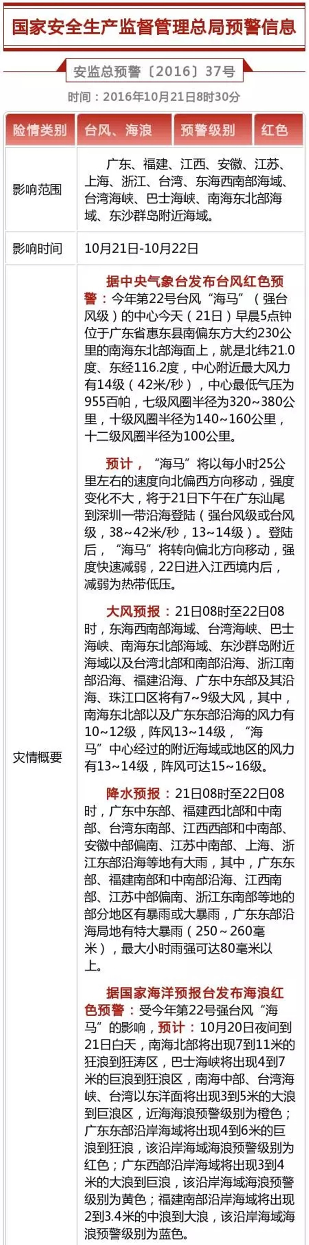 【紅色預警】"海馬"登陸廣東汕尾,國家安全生產監督管理總局發布紅色預警,敬請做好防御!