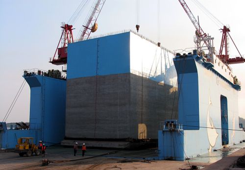 局、三公司及項目部領導高度重視防城港電廠這次重型沉箱的出運及安裝,項目部集中有經(jīng)驗的技術人員制定科學合理的施工方案,對現(xiàn)場施工人員進行詳盡的技術安全交底,制定了"沉箱出運安裝應急預防措施"。為安全完成沉箱的運輸安裝,三公司還對原承載2800噸級的四航"防城港"號半潛駁進行改造,在船首和船尾部各加長4.5米,塢體長度從原來的43米增加到52米,搭接平臺從原來的1.44米的高度縮短到0.9米,裝載量從2830噸增加到3200噸,大大提高了該船的工作性能。為確保運載和安裝的安全,改造后的"四航防城港"號提前到現(xiàn)場進行試潛,并挑選對大型構件出運安裝有著豐富經(jīng)驗的謝先和擔任指揮。